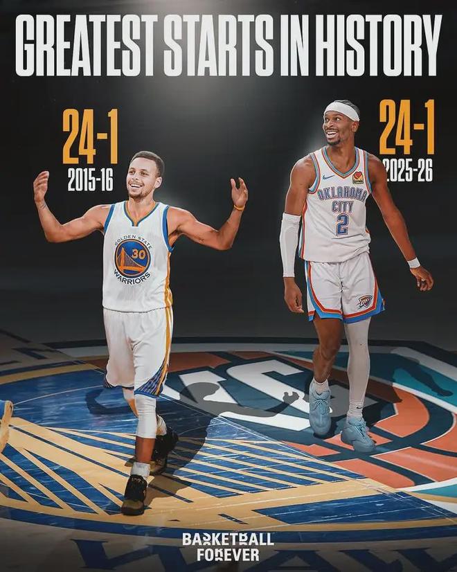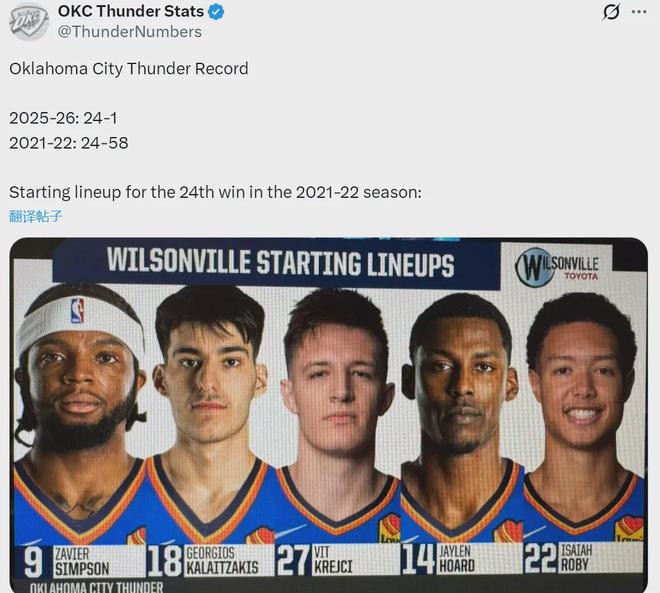 2021-22赛季,雷霆常规赛战绩只有24胜58负。短短四年,西部鱼腩变成了联盟老大。开季前25场比赛,雷霆总净胜分达到了439分,高居NBA历史第一。历史第二是1966-67赛季的凯尔特人380分,第三是2016-17赛季勇士375分。