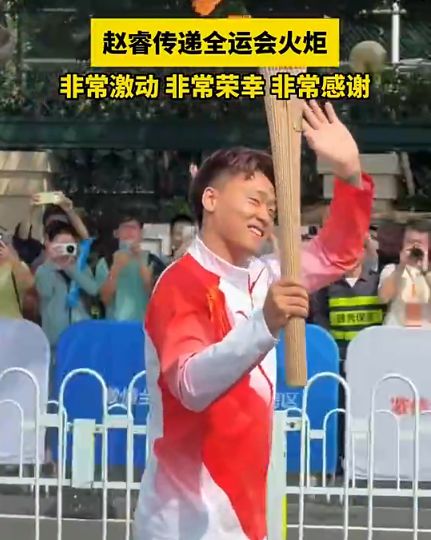 赵睿穿着全运会运动服,右手高举火炬奔跑完成传递,并且挥手向观众示意。