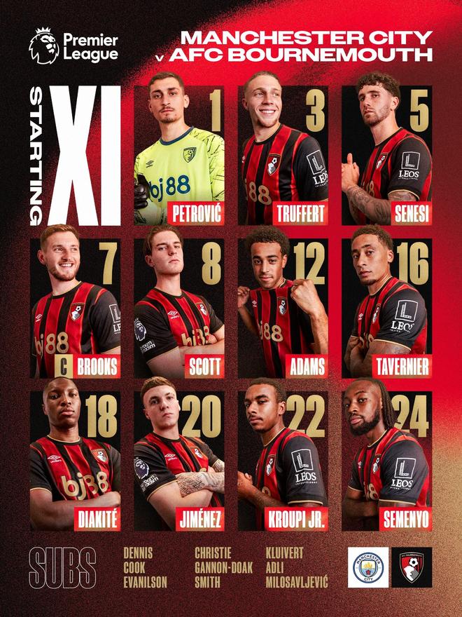 伯恩茅斯首发:1-彼得罗维奇、3-特吕费尔、5-塞内西、18-迪亚基特、20-希门尼斯、12-泰勒-亚当斯、8-亚历克斯-斯科特、7-戴维-布鲁克斯、16-塔韦尼耶、24-塞门约、22-克鲁皮